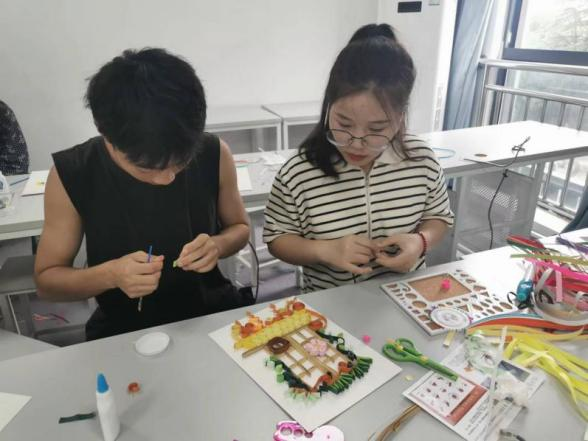 在学院老师的陪伴下,员工们用七彩衍纸表现江南故里,把对爸爸妈妈的思念、对亲人朋友老师们的祝福装进相框,折进“彩纸作品”里。同时也感受到了学校就是“家”,老师就是“亲人”的温暖。