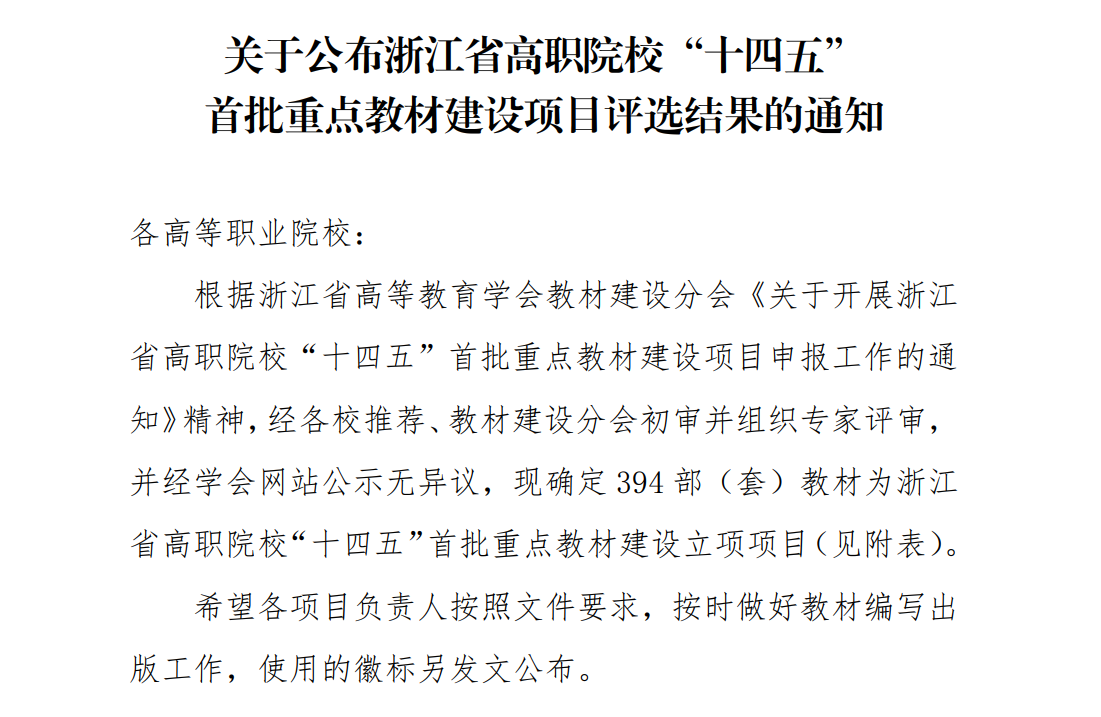 近日,浙江省高等教育学会公布了浙江省高职院校“十四五”首批重点教材建设项目评选结果,我校《英语实训教程——商务英语听说》等9部教材获批立项。