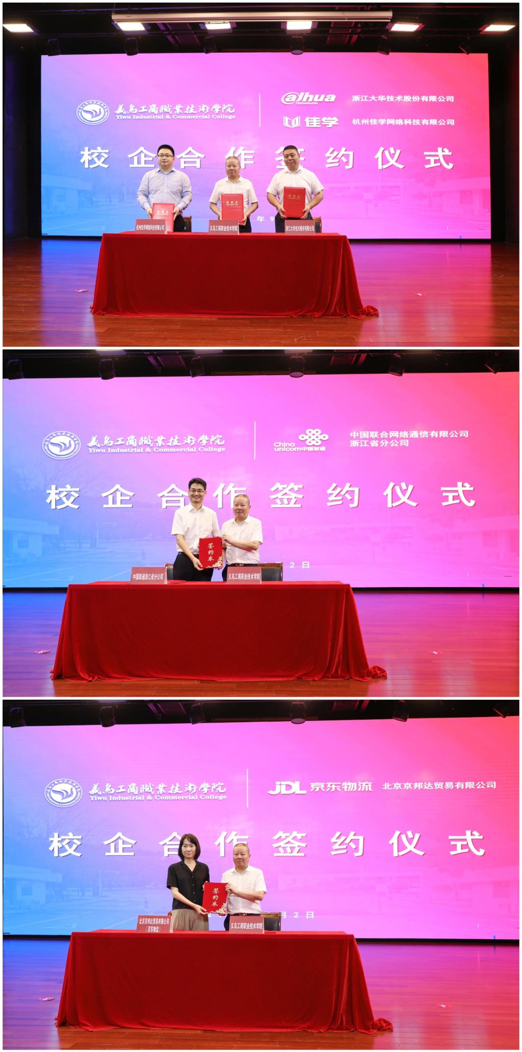 校企合作签约暨授牌仪式上,院长马广代表学校,与浙江大华技术股份有限公司、杭州佳学网络科技有限公司、中国联通浙江省分公司、北京京邦达贸易有限公司(京东物流)等4家高端企业签订了校企合作协议。党委书记李昌祖为合作企业 “产教融合育人实践基地”授牌。本次合作签约的企业中有世界500强企业、中国500强企业、行业龙头企业、国家产教融合型企业,这是学校首次与国家产教融合型企业开展校企合作。